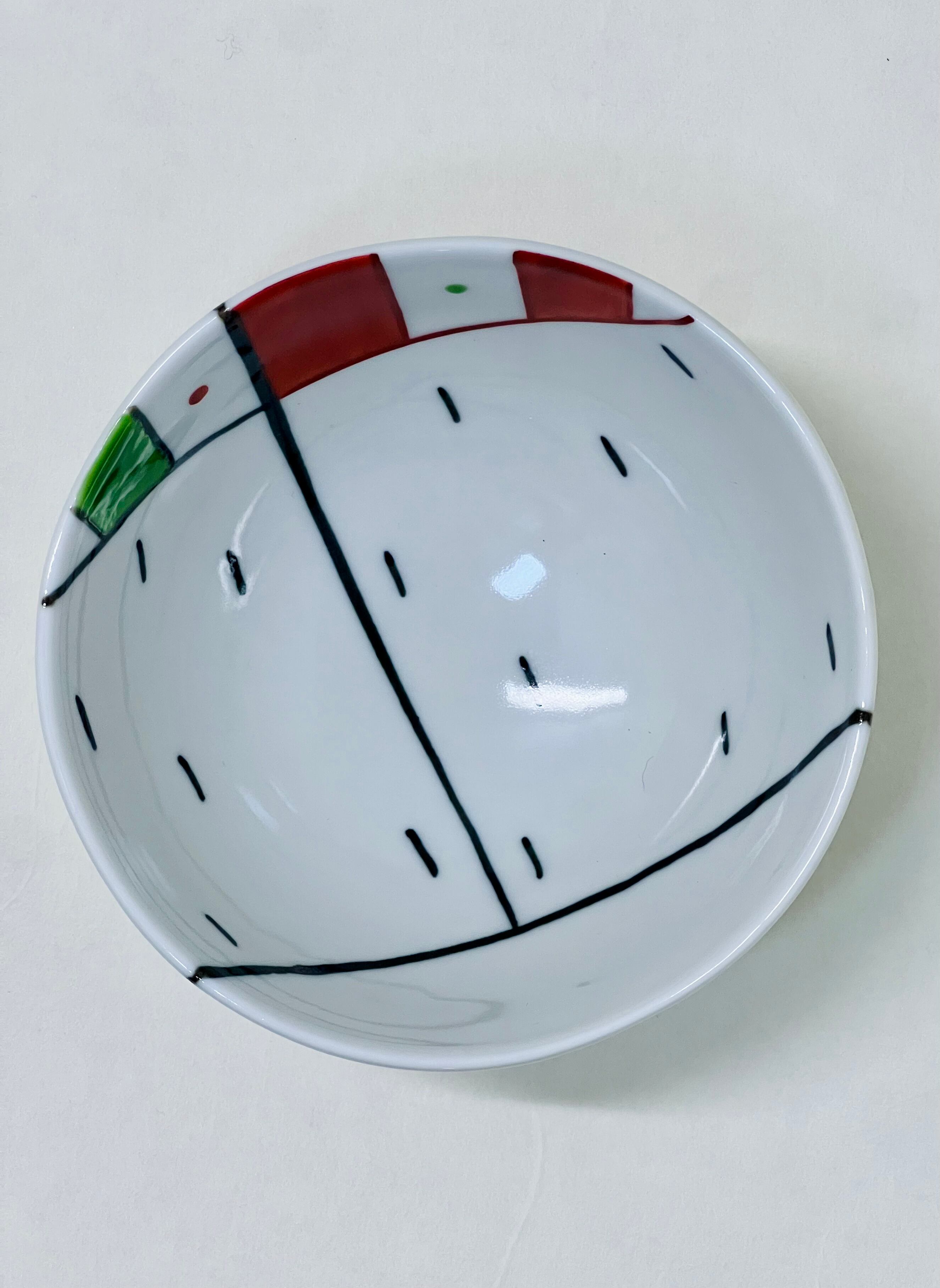 イタリアの国旗をモチーフにした三色(白、赤、緑)のアクセントが目を引く個性的なデザインの有田焼の茶碗です。